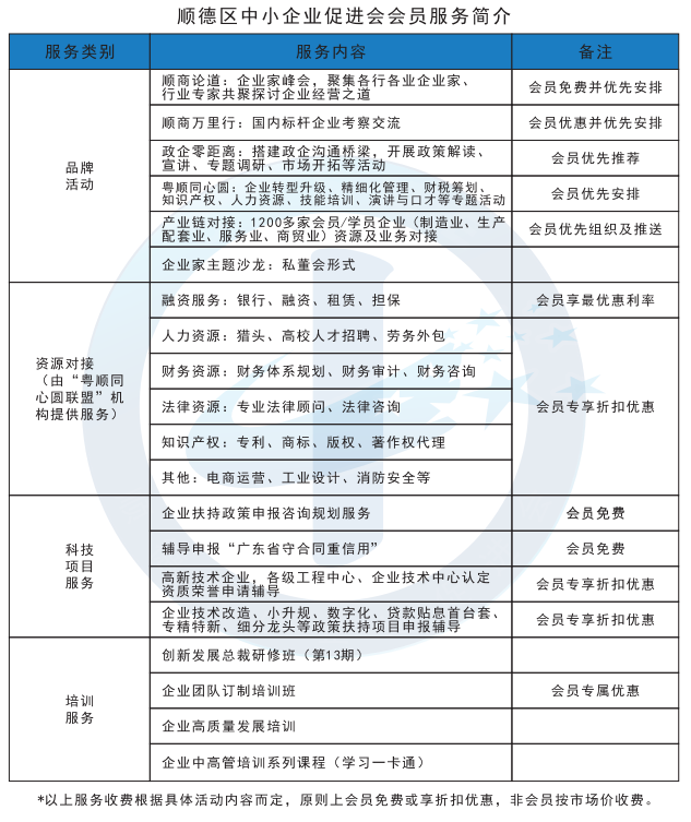佛山市顺德区中小企业促进会成立于2007年12月26日,是在顺德区经促局指导下,由区内广大中小企业、中小企业服务提供商自愿组成,旨在为中小企业提供综合性服务,属于非盈利性社团组织。促进会秉承“为中小企业服务、促中小企业发展”的宗旨,采取与行业商协会错位发展、优势互补、市场化运作的模式,整合各类优质资源,完善中小企业公共服务体系,搭建政企互动平台,协助中小企业用足、用好政策,成为连接政府、企业与机构的桥梁和纽带。15年来,打造了 “顺商学院”、“顺商论道”、“顺商万里行”、“粤顺同心圆联盟”、“暖企行动”、“政企零距离”、“顺商金牌团队训练营”等服务品牌。主要业务包括四大模块:项目申报、投资融资、市场开拓和管理提升。