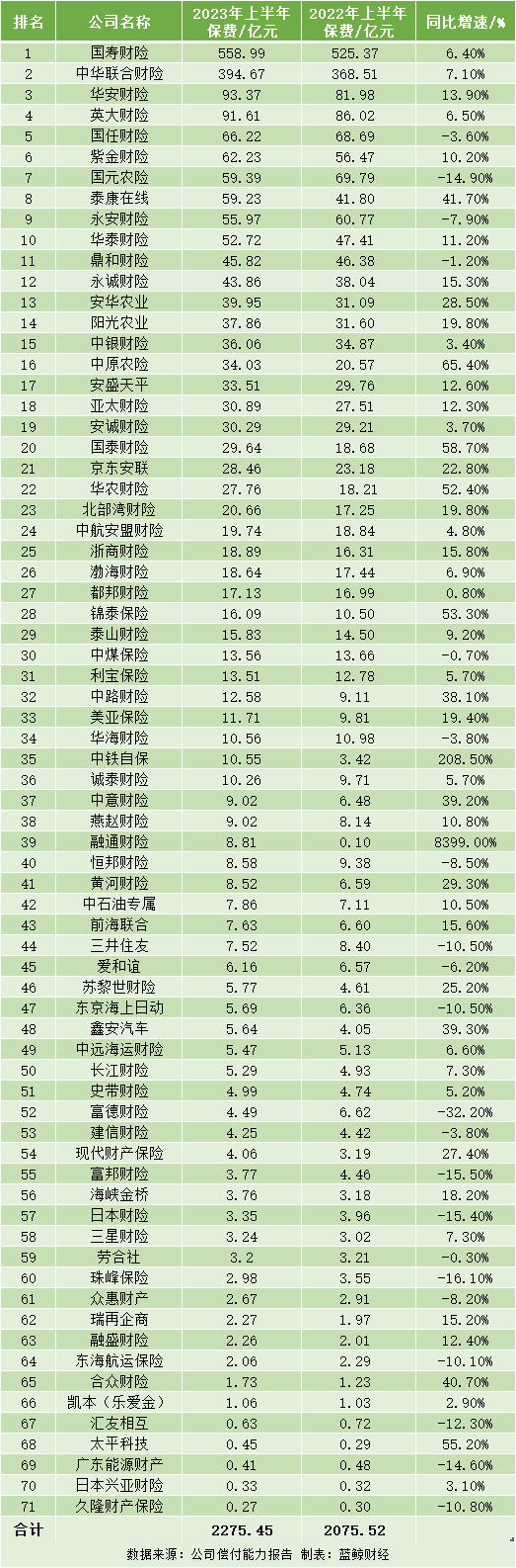 先聚焦于保费规模,据蓝鲸财经统计,剔除数据为负的安心财险后,已披露偿付能力报告的71家非上市财险公司,在上半年合计揽入保险业务收入2275.44 亿元,较去年同期增长9.63%。