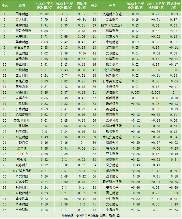 与去年同期相比,有52家财险公司实现净利润正增长,占比超七成。众惠财险、泰山财险、汇友相互、安诚财险、北部湾财险、恒邦财险等6家财险公司实现转亏为盈。另有20家公司出现亏损,同时也有7家公司由盈转亏,中原农险以1.73亿元的亏损排名第一,安心财险以0.88亿元的亏损紧随其后。