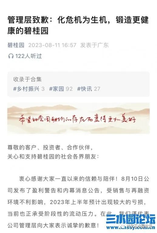 尊敬的客户、投资者、合作伙伴,关心和支持碧桂园的社会各界朋友: 衷心感谢大家一直以来的信赖与陪伴!8月10日公司发布了盈利警告和内幕消息公告,受销售与再融资环境不利影响,2023年上半年预计出现较大的亏损,当前也正承受阶段性的流动压力。