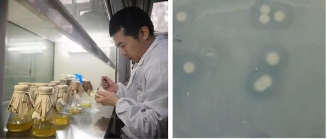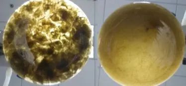 ✷左边是没有菌的海带;右边是加菌培养后的海带,高活性褐藻胶裂解酶已经把海带降解成渣。