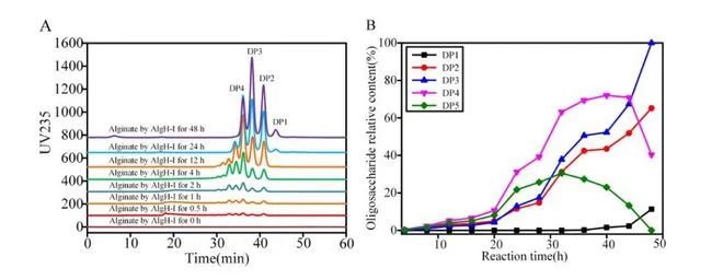 ✷ A表示褐藻胶裂解酶酶解后产物褐藻寡糖时程分析;B表示褐藻寡糖的相对含量
