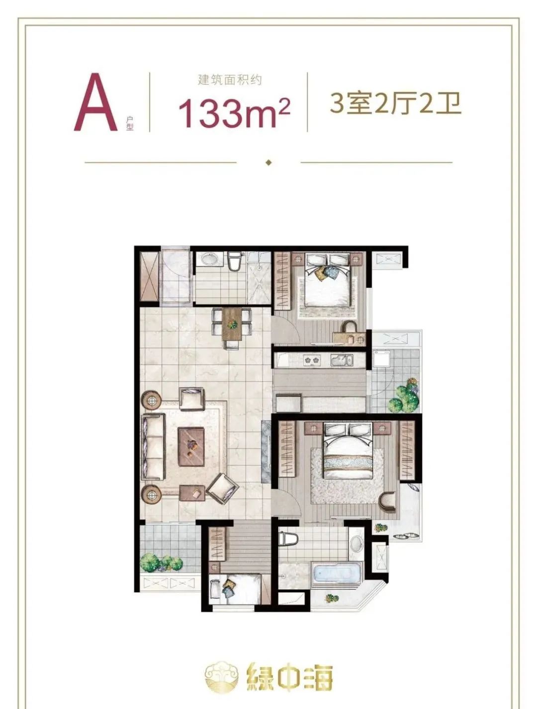 133㎡的户型,两房朝南,一房朝东/西,仅有主卧带飘窗,客厅虽有阳台,但是面积很小,同样有一个卫生间是暗卫。