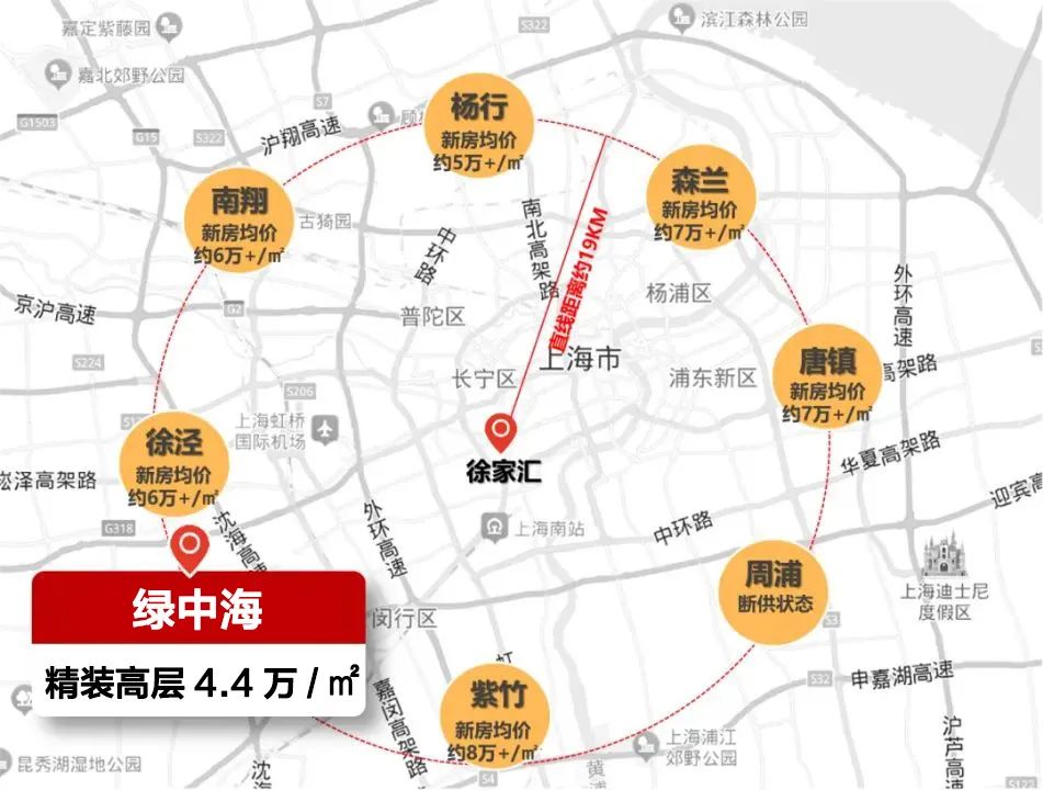 直线距离徐家汇副中心约19km同等市区半径下