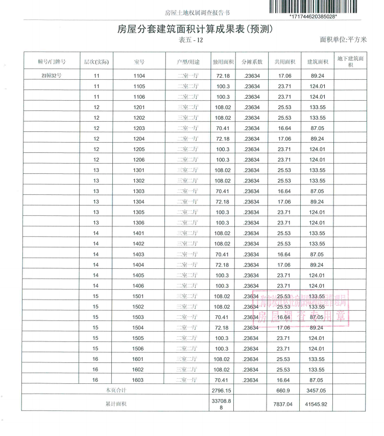 房屋分套建筑面积计算成果表