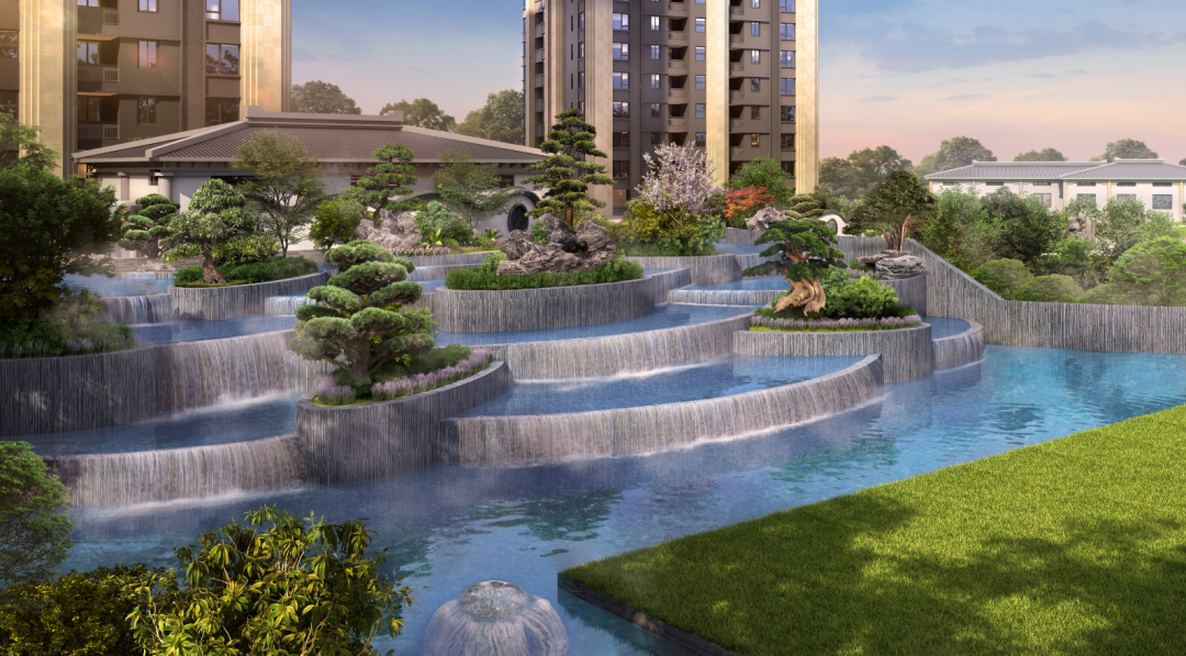 项目社区外部沿街绿化景观,由多重花坛组成,搭配大小灌木和香樟等名贵树种;社区内部植被丰富,设置众多艺术雕塑、景观休闲步道、中央景观层叠式水瀑布、儿童游乐场等。
