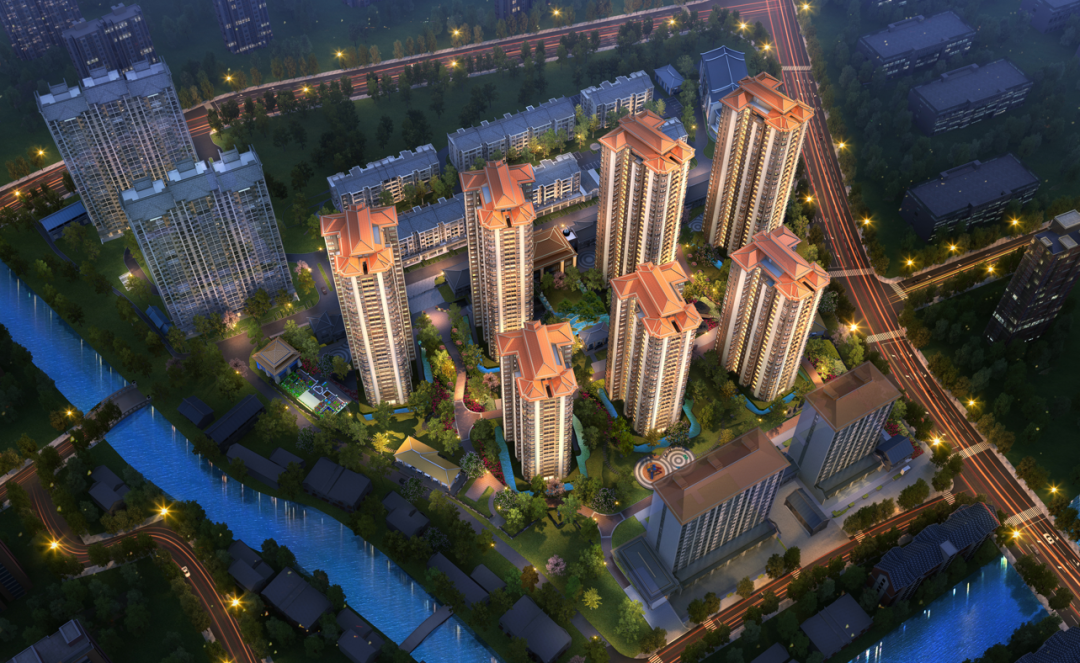 社区内每栋住宅的东、南、西三面,皆以U型水系环绕,与住宅主体结合,寓意前有财水背有靠山;