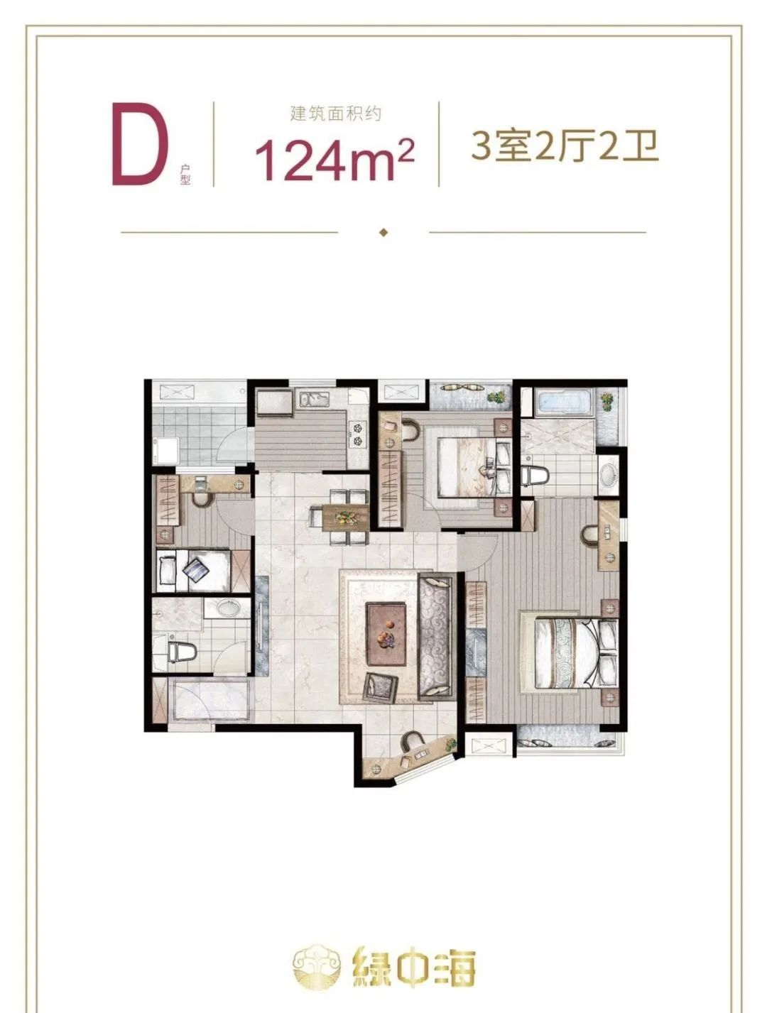 124㎡的户型,虽然主卧实现了南北通透,但其他两个房间均朝北,一个卫生间是暗卫,客厅在中间,也失去了阳台的设计。