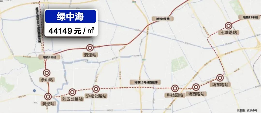 在直线距离徐家汇副中心约19km同等市区半径下,多数板块如唐镇、森兰、紫竹、徐泾、南翔的新房价格动辄都是约6~8w+/㎡。泗泾绿中海以9站徐家汇,再加上此次仅约380万起的总价,可谓是同期同价位新盘里的高性价比佼佼者。