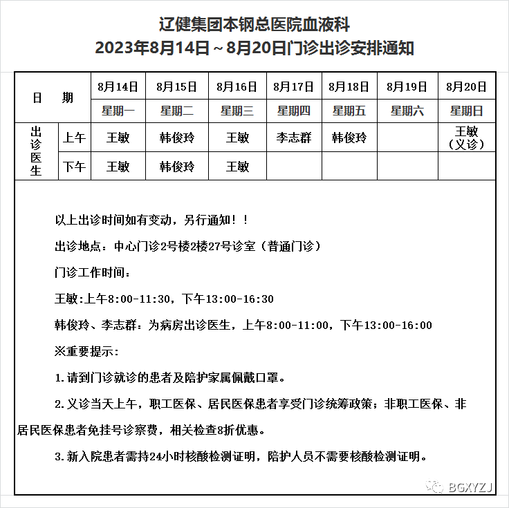 辽健集团本钢总医院血液科2023年8月14日~8月20日门诊出诊安排通知