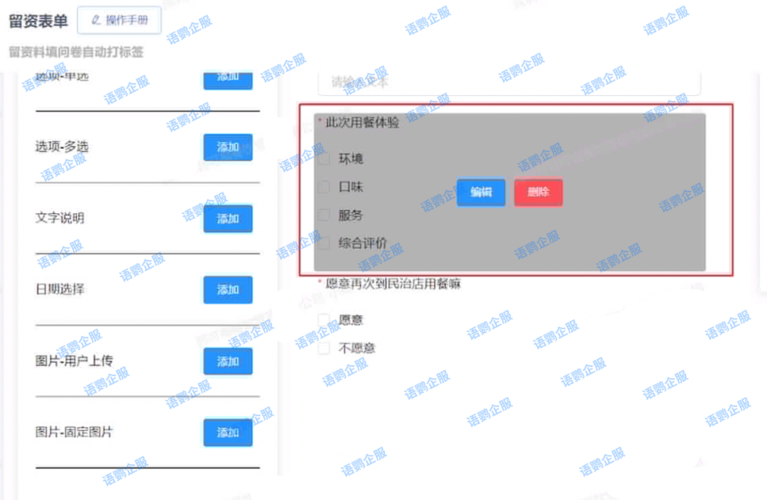 可以通过语鹦企服的「到店提醒」功能提醒店员给客户发送一份专属的问卷调查,体现门店的专属服务和对客户的重视度,问卷调查可以使用语鹦企服的「留资表单」功能,在客户用餐即将结束时将问卷调查结合“填问卷送礼品”的形式引导客户填写。