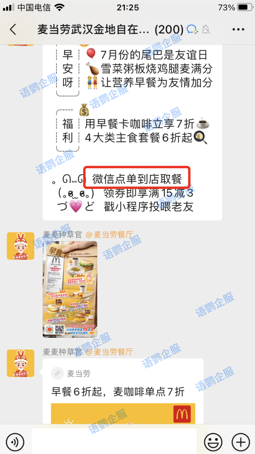 可以社群投放优惠券并且在加赠到店额外领取优惠券后的双重福利引导至门店,通过利用语鹦企服的「到店提醒」功能,客户到店和核销使用优惠券之后店长会有提醒,此时店长在收银核销再抵扣额外的券,这种形式会让客户更加积极的前往门店的消费,增强客户与门店的互动。比如点击麦当劳的“微信点单到店取餐”就会有专属于门店客户的福利。