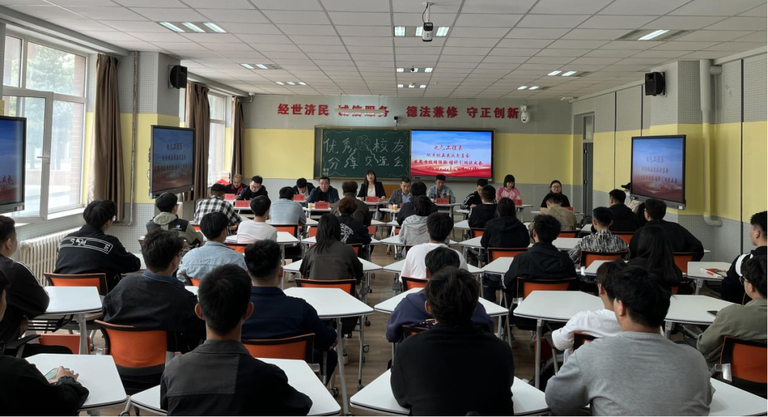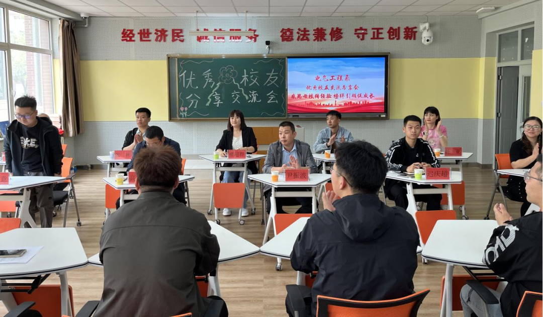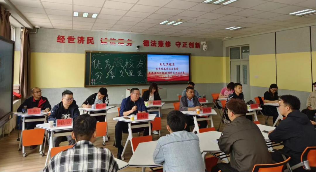 为搭建学校与校友之间沟通交流的桥梁,激发校友爱校荣校热情,发挥优秀校友对在校学生的榜样引领作用,激励莘莘学子奋发学习,进一步浓厚校园学习氛围,电气工程系于2023年6月19日中午在D101教室开展“感恩母校传经验 榜样引领促成长”优秀校友交流分享会。本次交流会由电气工程系团学办公室主任褚超群主持,特别邀请内蒙古鄂尔多斯电力冶金集团股份有限公司氯碱化工分公司PVC一工厂动力分厂厂长尹振波、PVC二工厂动力分厂厂长高树德、PVC二工厂动力分厂电气车间工段长刘如意和人力资源共享中心招聘主管迟庆超四位优秀校友主讲,电气工程系党总支副书记张婷凯、电力教研室负责人张彬以及电气工程系学生科教师韩金峰、托亚、李春满参加本次分享会。