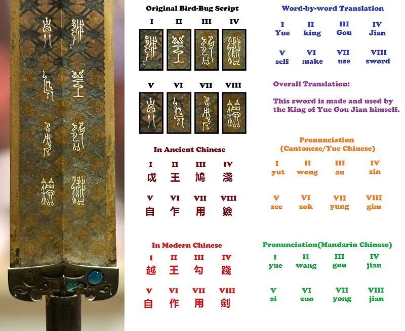 其次,让我们一窥这把宝剑的历史价值。越王勾践剑代表了战国时期越国的文化和技术水平。这把宝剑的制作工艺展现了当时的铸剑技术的高超程度,复合金属工艺的应用让剑具备了优异的硬度和韧性。剑身上的鸟虫书铭文则为我们留下了宝贵的古代文字实物,对于研究古代文字和书法艺术具有重要意义。这把宝剑也在考古、历史、文字学和艺术领域具有重要价值,为我们了解古代文化提供了珍贵资源。