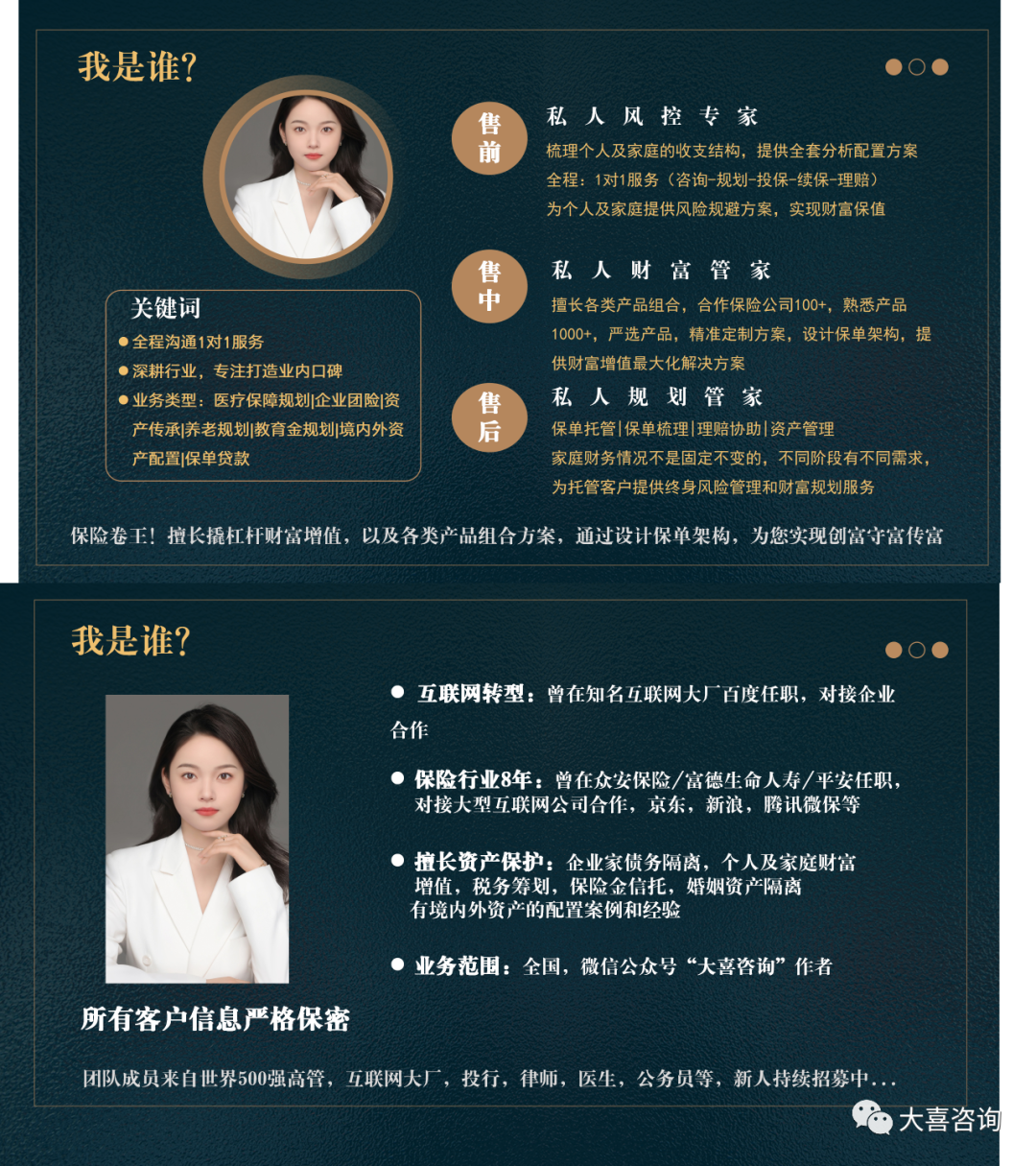 大喜是一名90后保险经纪人,不为任何保险公司带盐,从客户需求出发,业务范围:团体险|养老规划|资产配置(境内/海外)|高端医疗|医疗保障,工作之余也会学习新知识,不断拓展认知边界,希望能像平安叶老师一样,把保险做为一辈子的事业,持续深耕, 匠心运营。