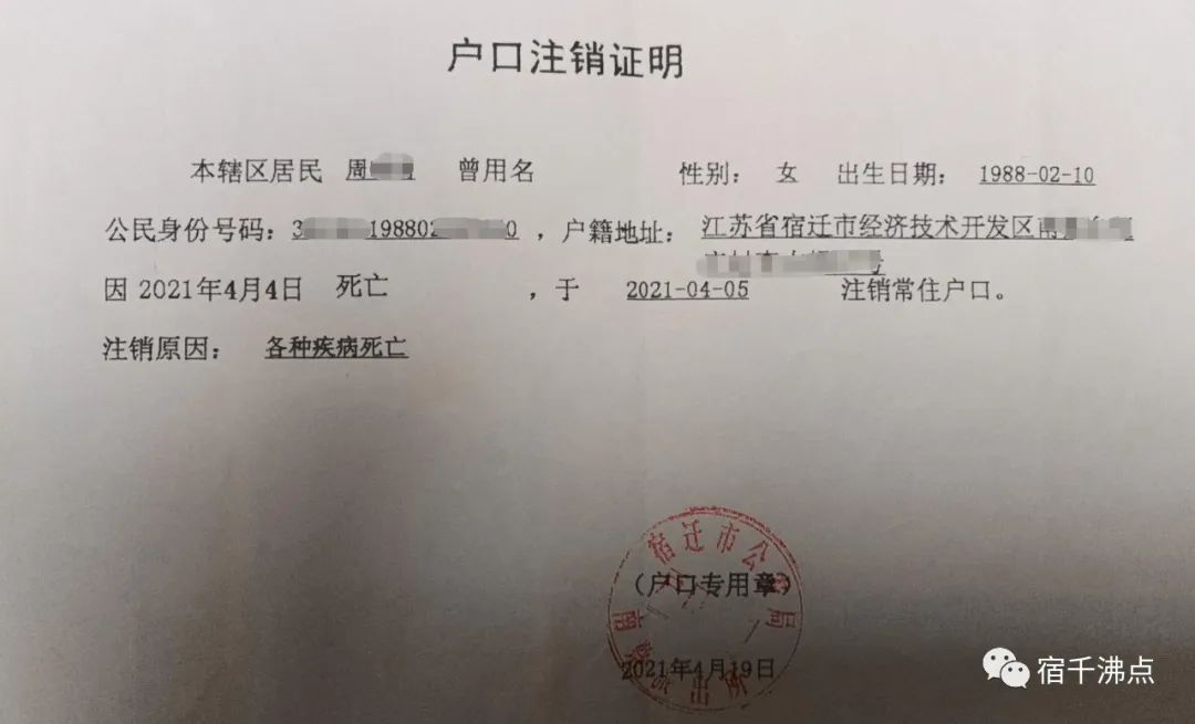 2021年4月3日,周某某因患直肠癌含恨离世。4月19日,周某某母亲带上户口本前往属地警所提出注销事宜。可令人奇怪的是,有关人员告诉周某某母亲,其女儿户口已经与4月5号被注销了。当日前来注销的人是周某某丈夫李Y。由此可见,有人急不可耐想和周某某抛开关系。见图: