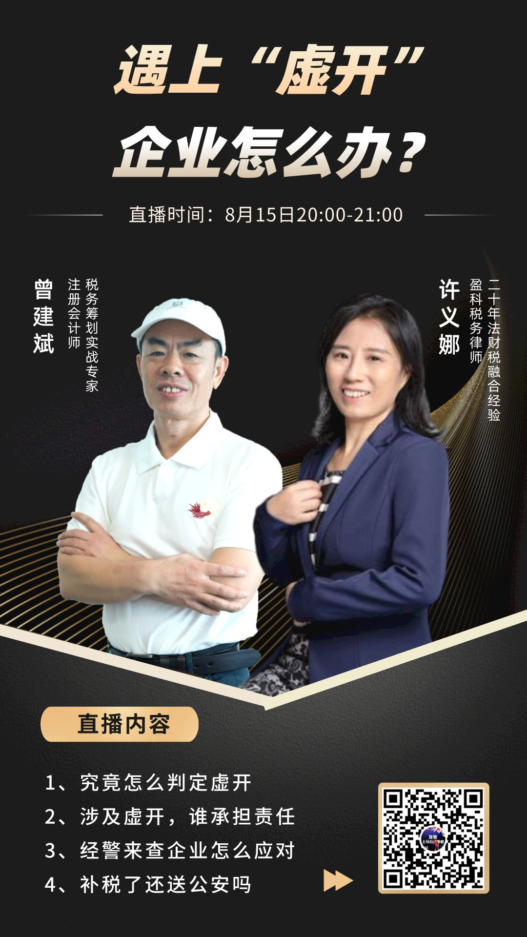 8月15日晚20:00,曾建斌老师将连麦嘉宾许义娜老师在线分享【遇上“虚开”,企业怎么办?】主题,本次直播「限时免费」,赶紧预约收听吧~