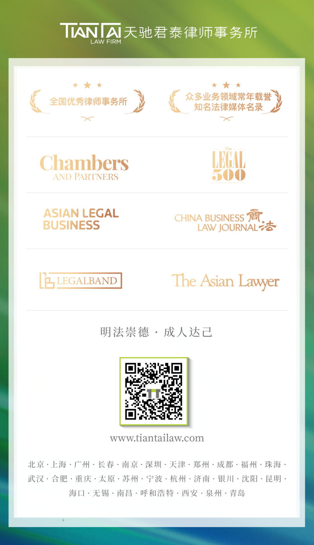 天驰君泰是一家总部位于北京的规模型综合性律师事务所,在全球设有31个办公室,执业律师已达近2000人。自成立以来,天驰君泰获得了客户和业界的广泛赞誉,颇具知名度与影响力,已连续多年登榜钱伯斯、《亚洲法律杂志》(ALB)、《商法》、《法律500强》等法律评级榜单,曾荣获中华全国律师协会授予的"全国优秀律师事务所"称号,连续多年被北京市司法局和律师协会评为"北京市优秀律师事务所"。