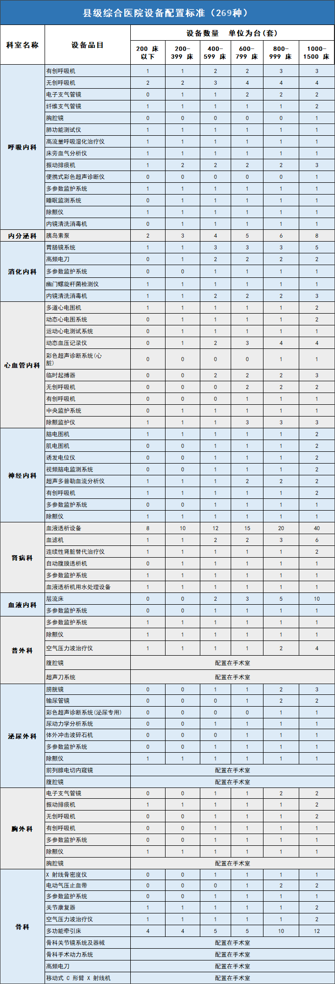 《标准》规定了县级综合医院万元及以上设备配置的基本原则,并根据医院规模提出各科室设备配置的品目和数量:
