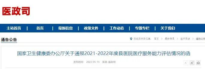就在今年5月,国家卫生健康委发布《国家卫生健康委办公厅关于通报2021~2022 年度县医院医疗服务能力评估情况的函》。