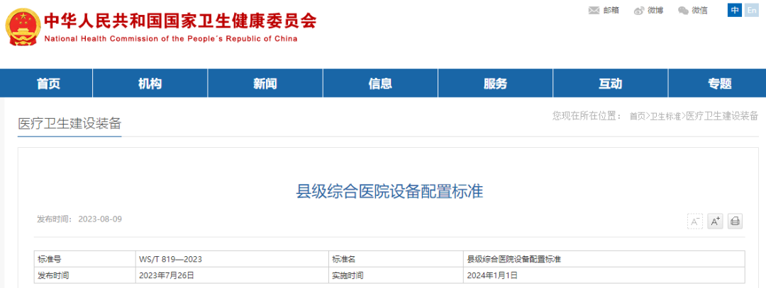 就在昨天(8月9日),国家卫健委发布了WS/T 819—2023《县级综合医院设备配置标准》(以下简称《标准》)。