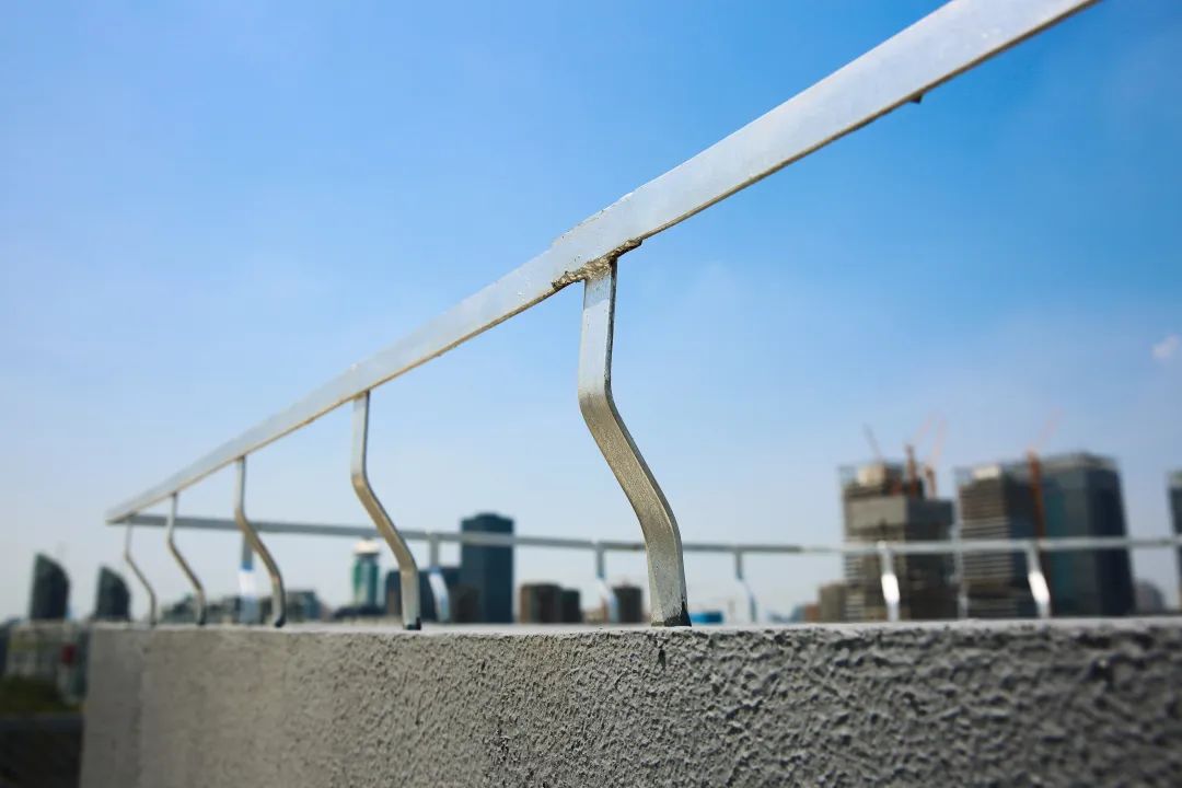 在屋面设备层,避雷带扁钢搭接符合规范要求,造型与墙外沿平齐,充分满足安全功能性。室外管道穿墙处采用金属装饰板封堵,缝隙打胶密实,满足功能性的同时提高了观感质量。