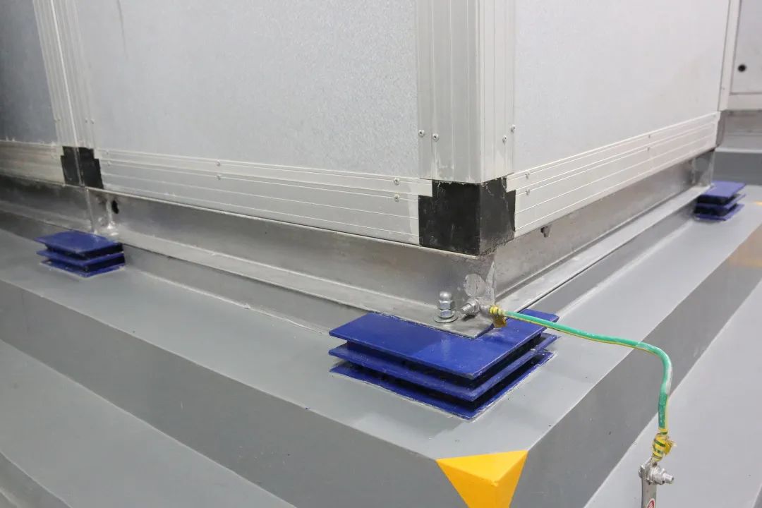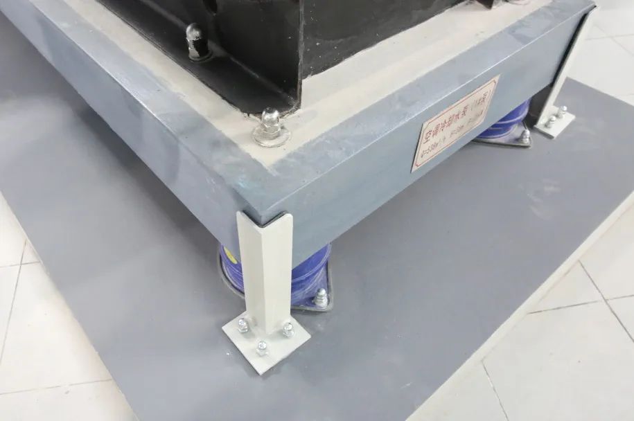 在空调箱底部采用钢板与减震垫结合的措施达到受力均匀的目的,在保证减震效果的同时,避免了设备因为自重受力不均匀变形而产生异响的情况。空调水泵设置减震台座,台座四周设置弹簧减震器及防位移靠山,最大程度减小设备运转噪音的影响。