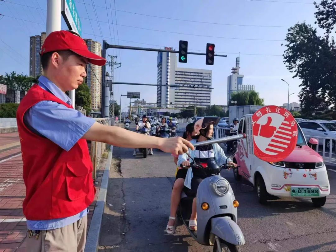 烈日之下,志愿者统一着装,身穿红马甲、佩戴小红帽、手拿指挥牌,在上下班高峰期来到湛北路和新华路十字路口,协助执勤交警维护交通秩序。执勤过程中,志愿者对闯红灯、不走斑马线、未按要求佩戴头盔等违反交通规定的行为进行劝阻和安全提醒,热心为广大群众提供出行指路服务,帮助老弱病残者安全通过斑马线,向行人讲解文明交通的意义,得到了过往市民的积极配合。