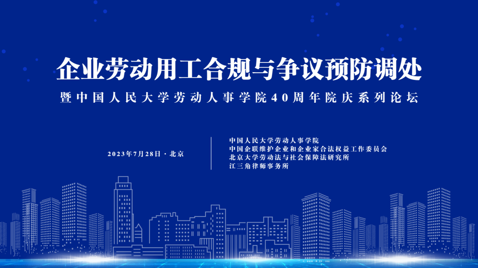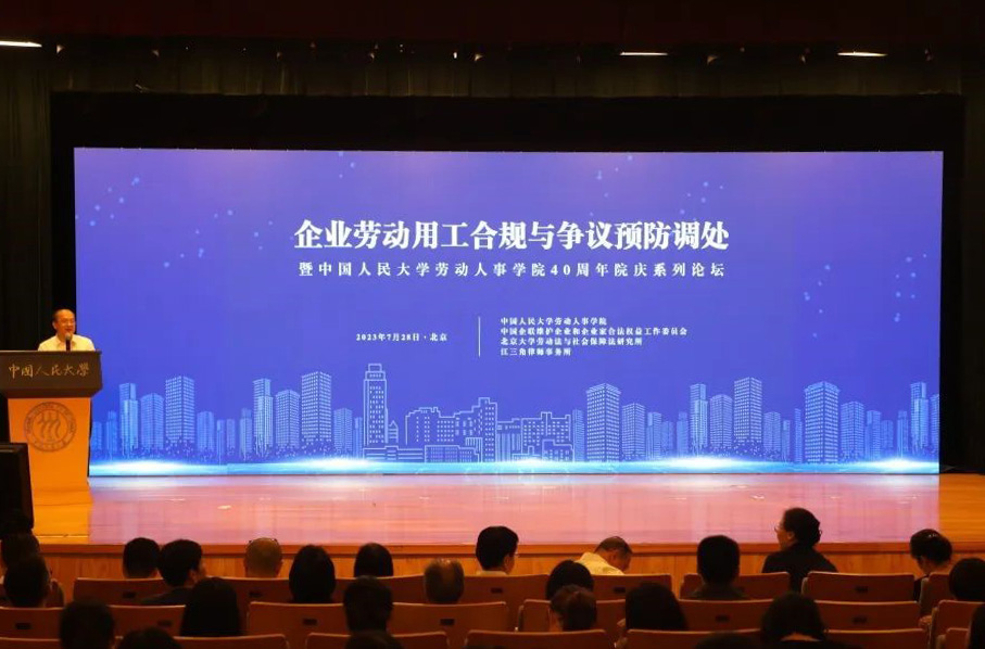 7月28日下午,由中国人民大学劳动人事学院、中国企联维护企业和企业家合法权益工作委员会、北京大学劳动法与社会保障法研究所、江三角律师事务所联合主办的“企业劳动用工合规与争议预防调处论坛——暨中国人民大学劳动人事学院40周年院庆系列论坛”成功举办。来自劳动法和人力资源管理领域的专家学者、律师、企业代表等300余人受邀来到我院参与本次论坛,交流信息、碰撞观点、分享经验。