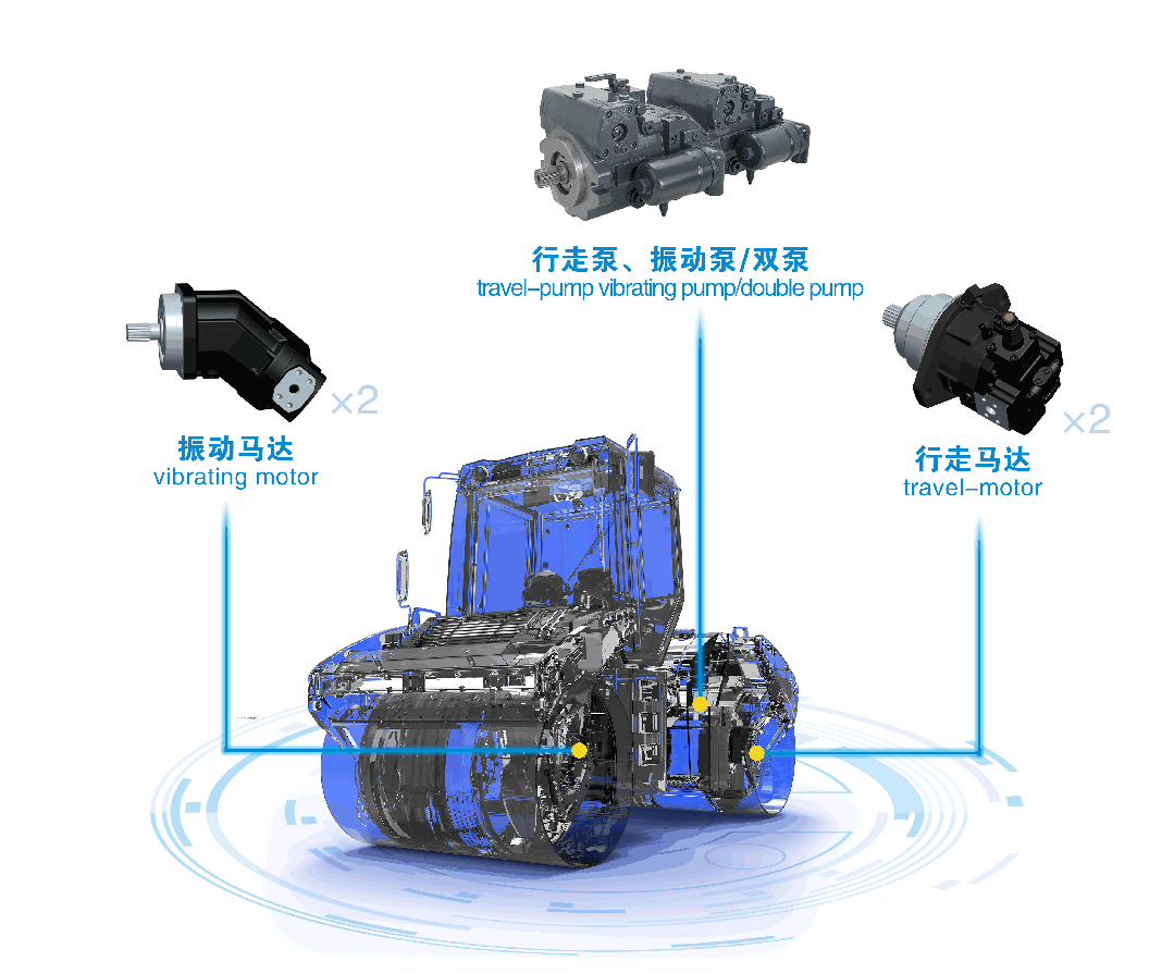 压路机非道路机械,属于路面机械主力产品。其主要的工况特点为:连续往复作业、启停频繁、负载波动大,对液压元件要求压力等级高、高可靠性,控制精准。