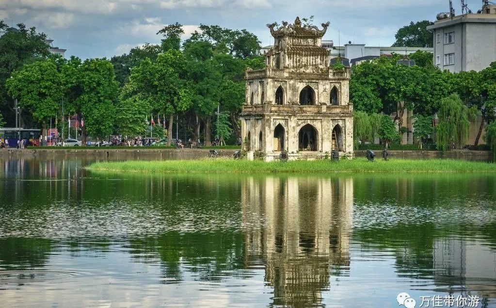 车观【还剑湖】,原名绿水湖,后因传说越南君主黎利在此得剑还剑而改为现名。湖周围有树木苍翠的林荫步道,是当地人纳凉、散步的休闲之所。椭圆形湖面上有两处中岛建筑,北边的是玉山寺,南边的是龟塔。