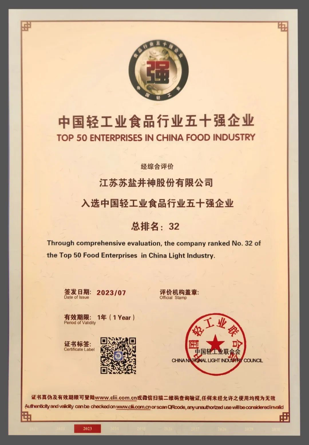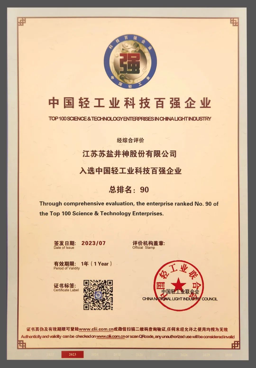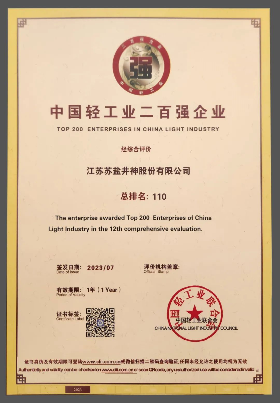 近日,以“迈向世界一流企业 服务人民美好生活”为主题的2023年中国轻工业百强企业高峰论坛在北京举行。论坛发布了2022年度中国轻工业二百强企业、中国轻工业科技百强企业、食品行业五十强企业名单,苏盐井神公司均榜上有名,这也是全国盐行业唯一一家同时获得三项荣誉的企业,标志着高质量发展走在全国盐行业前列。