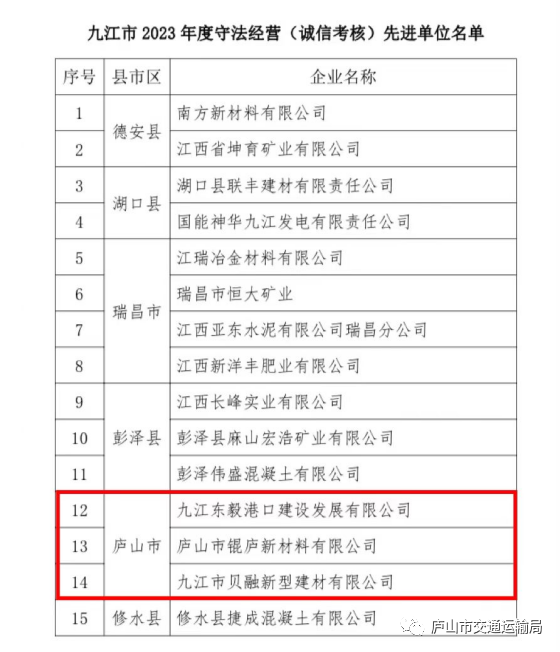 近日,根据省政府治超办《关于推进超限超载治理优化物流营商环境的通知》和省交通运输厅治超办《2023年江西省货物源头超限超载治理专项行动方案》文件精神,九江市治超办牵头组织开展了2023年度治超源头单位守法经营暨诚信考核工作,全市15家货物源头企业获评2023年度治超领域守法经营暨诚信考核先进单位,庐山市3家企业获评!