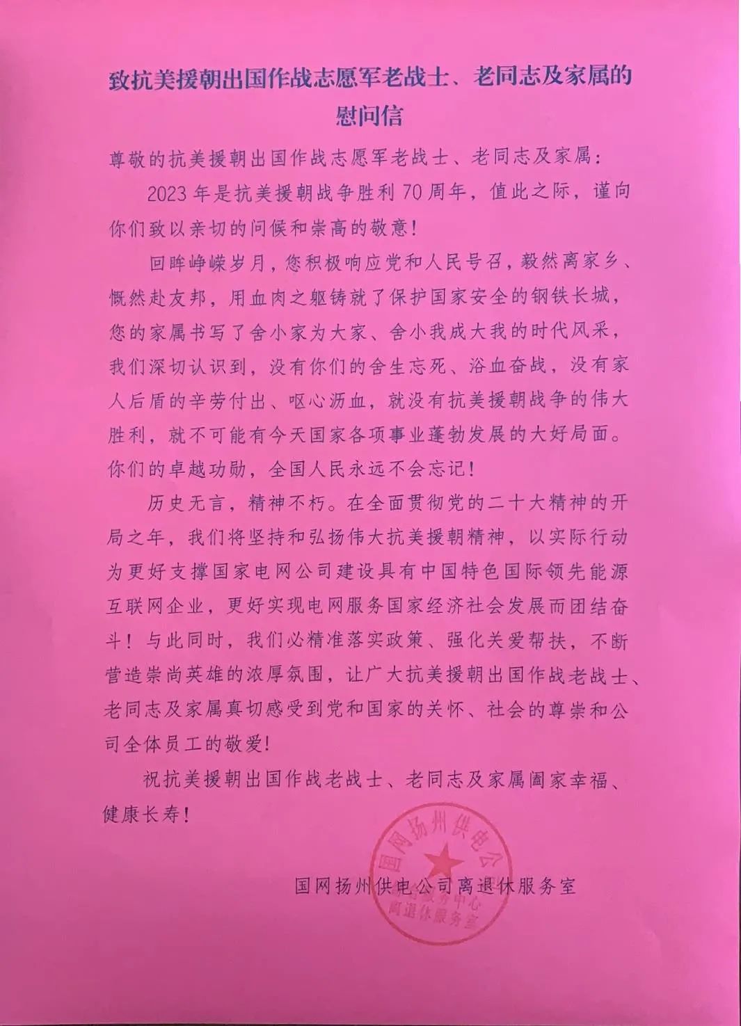 扬州公司离退休服务室代表扬州公司向赵老致慰问信,表达了要营造崇尚英雄的浓厚氛围,让广大抗美援朝出国作战老战士、老同志及家属真切感受到党和国家的关怀、社会的尊崇和公司全体员工的敬爱的关切之情。