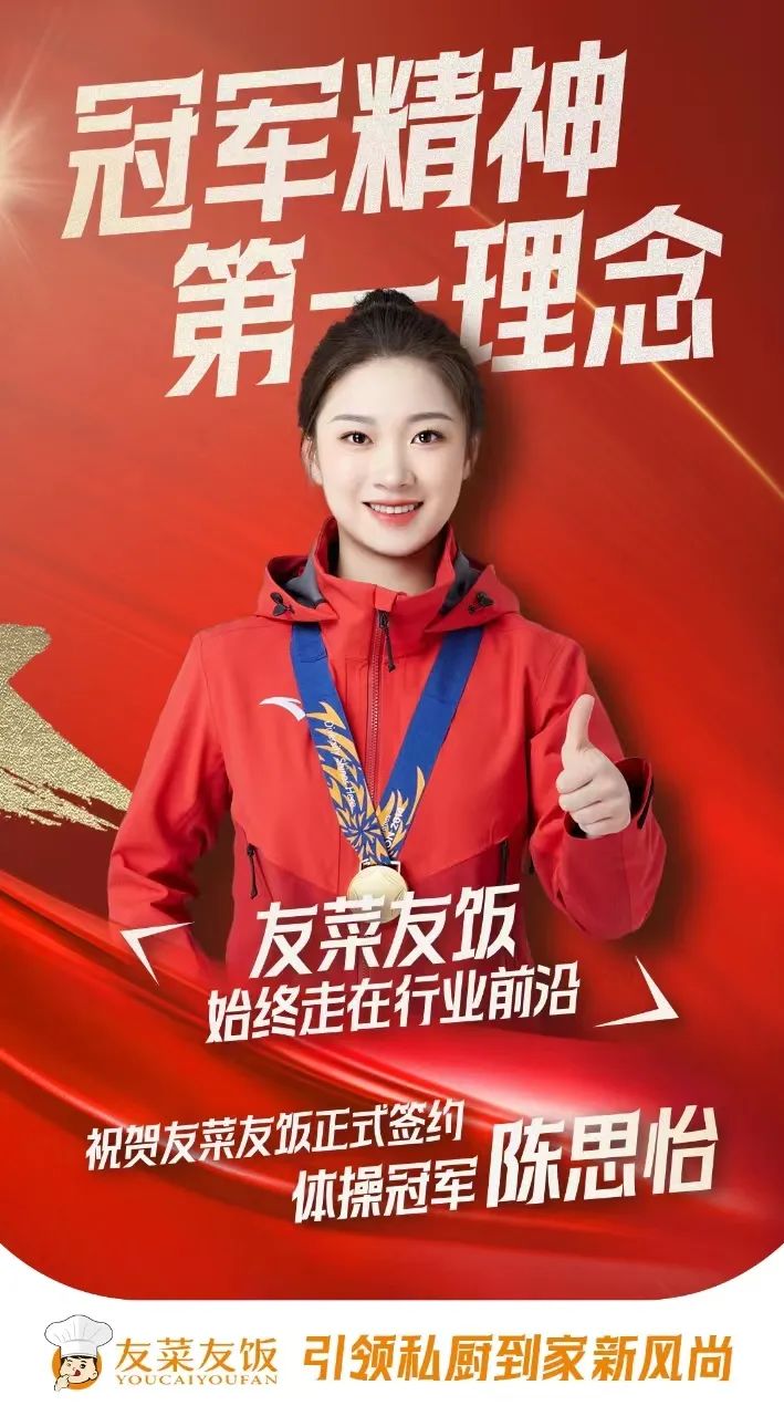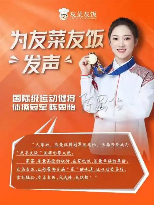 相信陈思怡女士和友菜友饭的这次合作,能将友菜友饭品牌推向一个新的高度,在此同时感谢大家对友菜友饭的支持,对陈思怡女士的支持。未来,关于冠军陈思怡和友菜友饭品牌的更多故事,请持续关注本号。