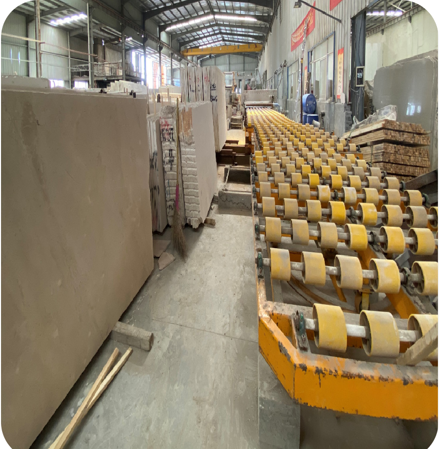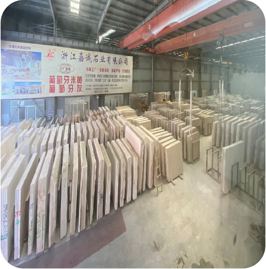 占地面积2万平方,常备大板8万平方以上,荒料9万吨,拥有BM拉锯六台、全自动抛光线三台、多台仿型机、红外线、线条机及异形加工机械并配备全自动水刀雕刻机。