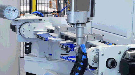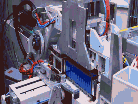 上料:将电芯传送到制定位置,机械手自动抓取送入模组装配线。