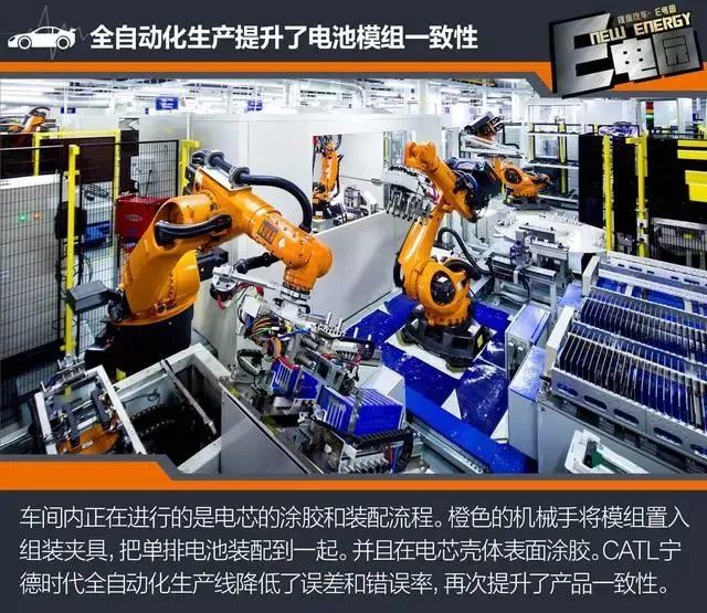 电芯组装前,需要表面涂胶。涂胶的作用除了固定作用之外,还能起到绝缘和散热的目的。CATL宁德时代采用国际上最先进的高精度的涂胶设备以及机械手协作,可以以设定轨迹涂胶,同时实时监控涂胶质量,确保涂胶品质,进一步提升了每组不同电池模组的一致性。