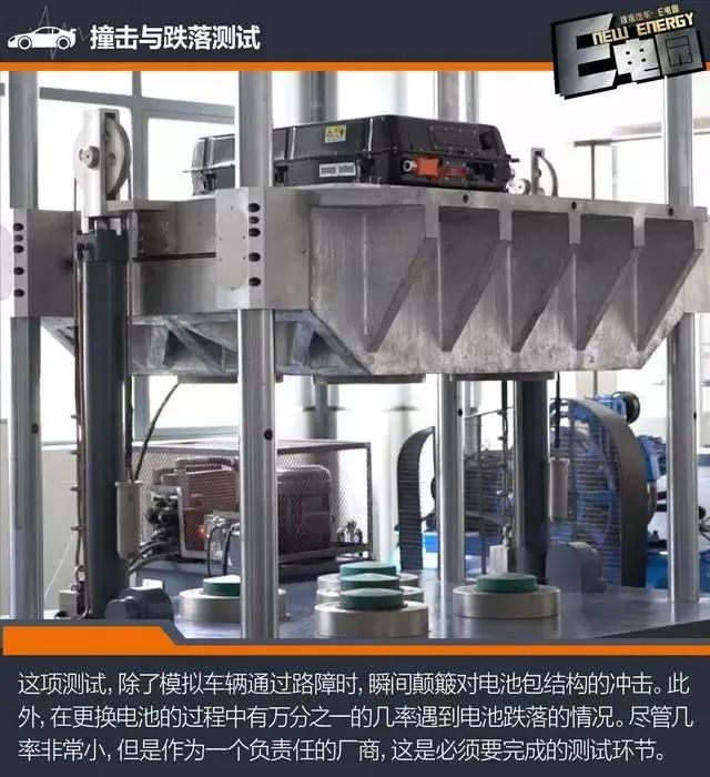 与振动试验类似,冲击测试用以测试电池包的机械结构稳定,其模拟车辆通过路障时,瞬间颠簸对电池包结构的冲击。此外,在更换电池的过程中有万分之一的几率遇到电池跌落的情况。所谓不怕一万就怕万一,CATL宁德时代将电池从1米高度进行自由落体测试,且保证各项功能依然正常。