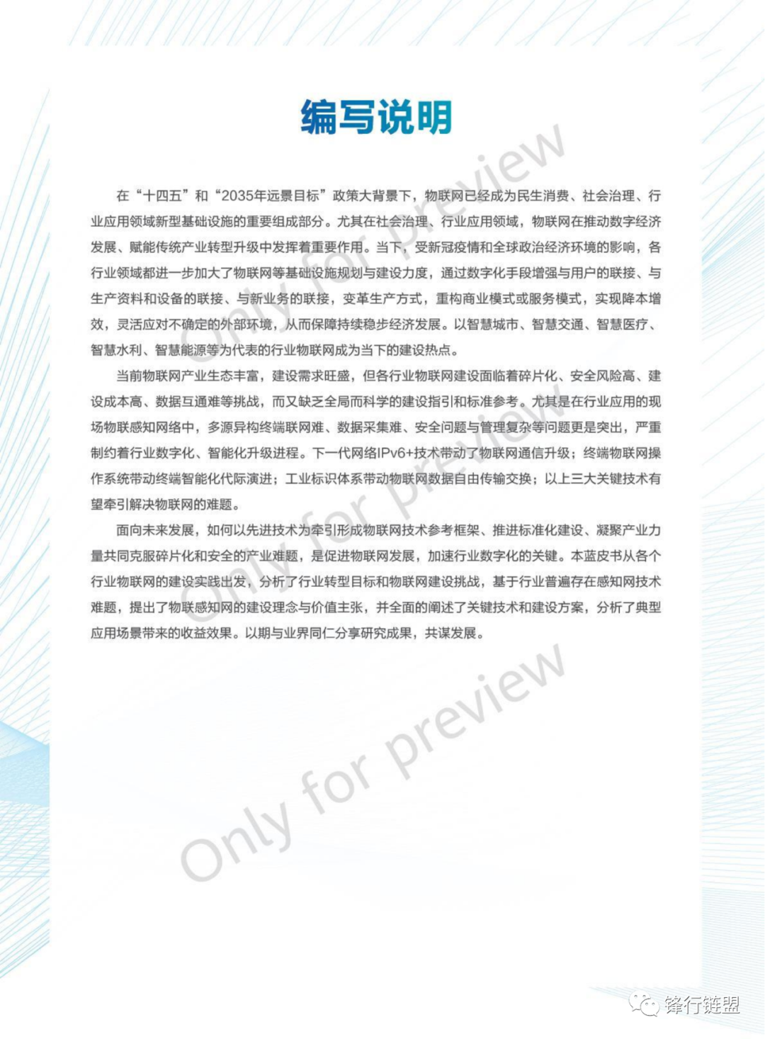 面向未来发展,如何以先进技术为牵引形成物联网技术参考框架、推进标准化建设、凝聚产业力量共同克服碎片化和安全的产业难题,是促进物联网发展,加速行业数字化的关键。本蓝皮书从各个行业物联网的建设实践出发,分析了行业转型目标和物联网建设挑战,基于行业普遍存在感知网技术难题,提出了物联感知网的建设理念与价值主张,并全面的阐述了关键技术和建设方案,分析了典型应用场景带来的收益效果。以期与业界同仁分享研究成果,共谋发展。