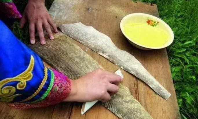 People place a folded piece of dried fish skin on a wooden board and beat it with a wooden stick, wooden mallet, or wooden axe. During the beating process, the fish scales naturally fall off and the skin gradually softens.
