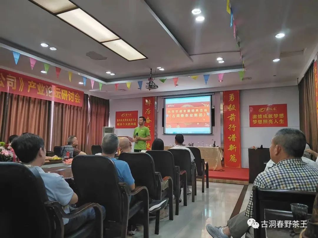 为期两天的湖南野生大叶茶科技有限公司产业论坛暨野茶王品牌启航研讨会于7月17日下午,在古洞春农业集团隆重举行。古洞春茶学院石副院长主持会议,来自武汉、长沙、湘潭等地的各路商界大咖欢聚一堂,旨在推介品牌,做大做强,沿着茶产业链上市的快车道携手共赢,勇毅前行谱新篇,踔厉奋发担使命。