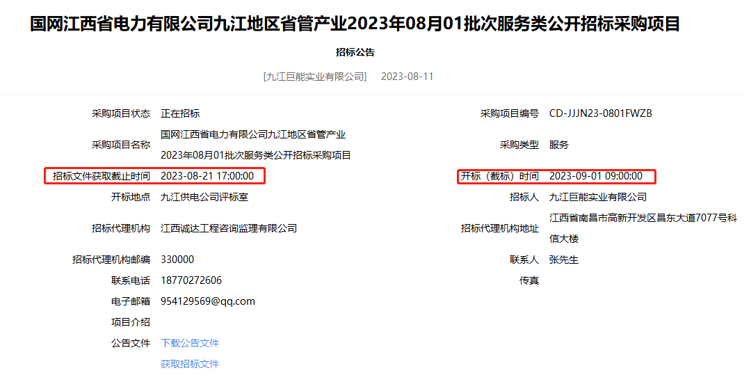 2023年09月01日9:00时,通过国网电子商务平台-电工交易专区公开开标。本次开标不再邀请投标人代表出席开标仪式,请投标人在开标结束后及时在电子商务平台确认报价,如有质疑请通过电子邮箱:954129569@qq.com提出(受理质疑时间为开标日上午9:00-11:00时,逾期不予受理),招标代理机构将提交评标委员会解决投标人提出的质疑。