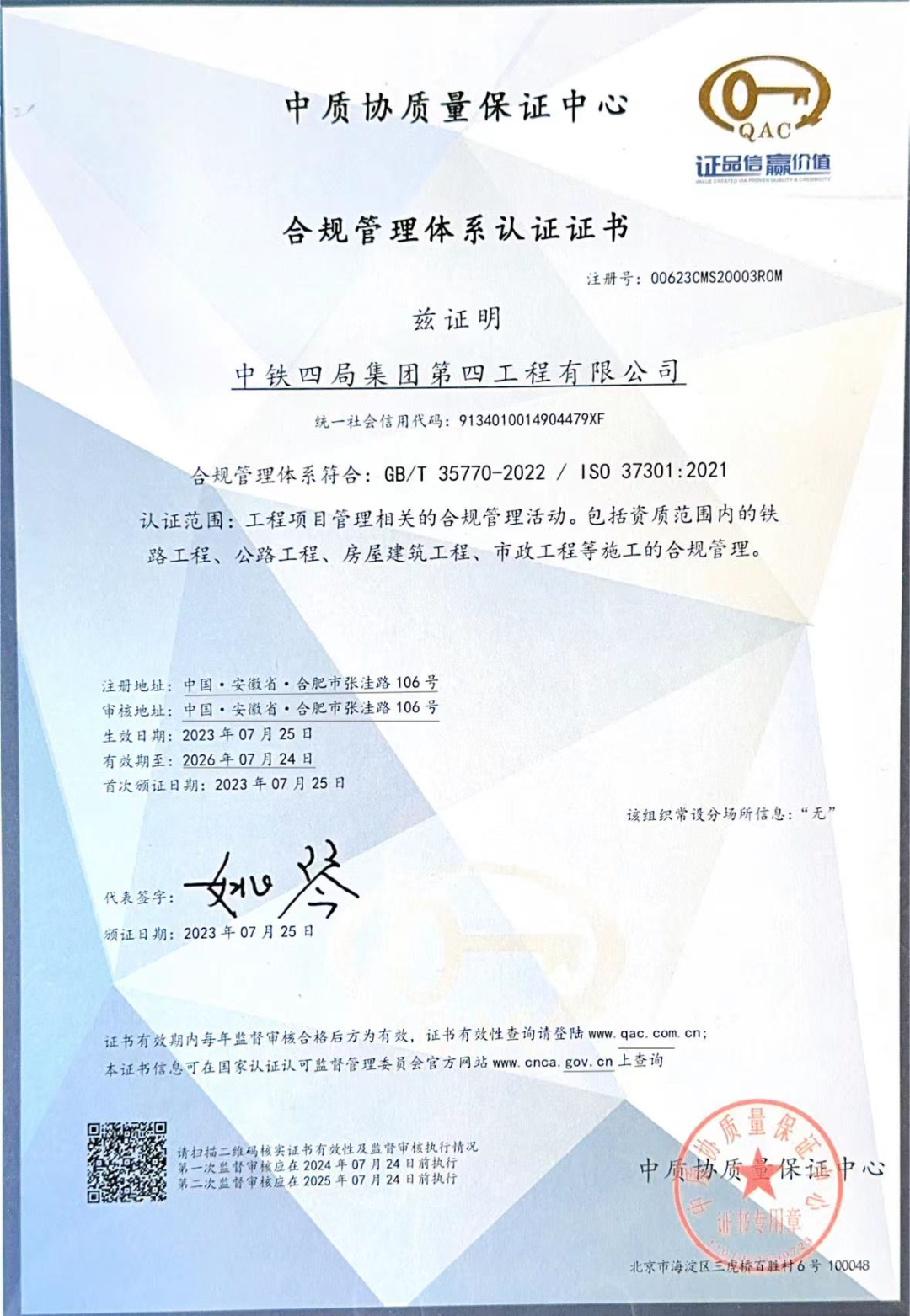 认证过程中,众铎合规团队始终保持着高度的专业性和强烈的责任心。从初期的调研、规划,到中期的实施、运行,再到后期的审核、改进,众铎合规团队都提供了全方位、全过程的辅导服务,积极辅导和推进中铁四局四公司的合规管理体系认证工作。在众铎合规团队的尽心辅导下,认证机构依据国际标准ISO37301:2021和国家标准GB/T 35770:2022,对中铁四局四公司合规管理体系的符合性和运行的有效性进行了严格的审核。审核结果表明中铁四局四公司符合国际和国内两个合规管理体系的要求,具有全球高水平的合规管理能力。