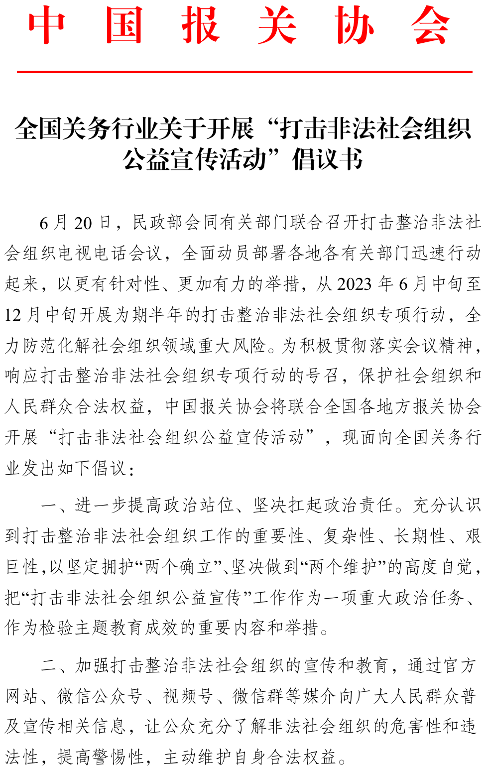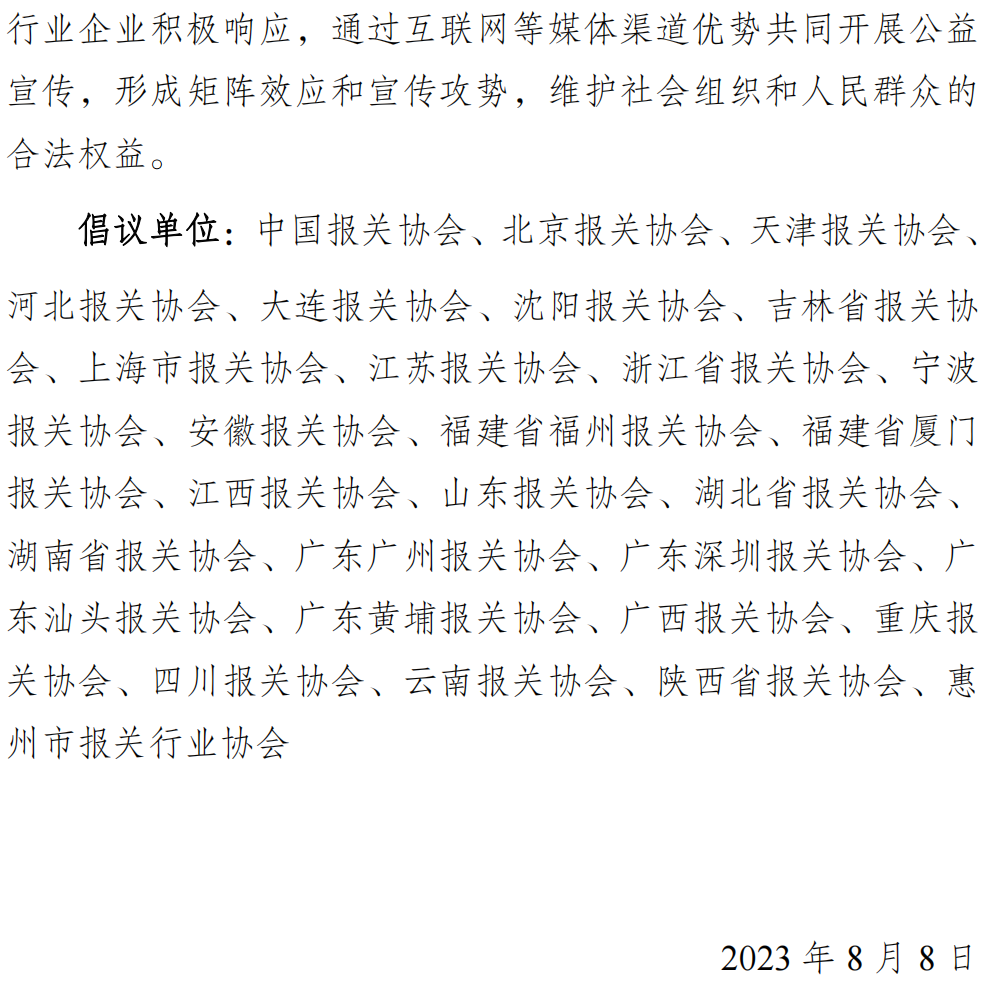 全国各地方报关协会对此项工作予以高度评价,并表示要积极动员关务行业企业如何甄别非法社会组织,会后中国报关协会携手全国各地方报关协会发起全国关务行业关于开展“打击非法社会组织公益宣传活动”的倡议。