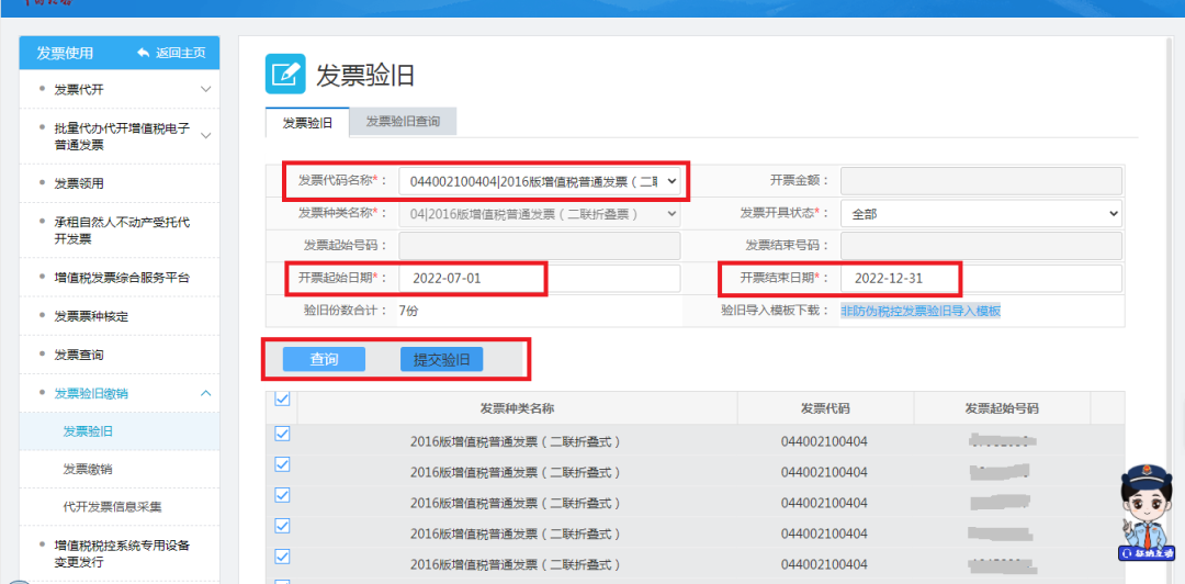 在发票代码下拉框选择需要验旧的发票代码,录入开票起始日期以及开票结束日期(查询跨度不超过半年),点击“查询”按钮。系统会根据开票起止日期,自动查询发票数据,将开票数据展示在待验旧列表中。如查询无数据,请核实对应发票在开票系统是否已完成上传。