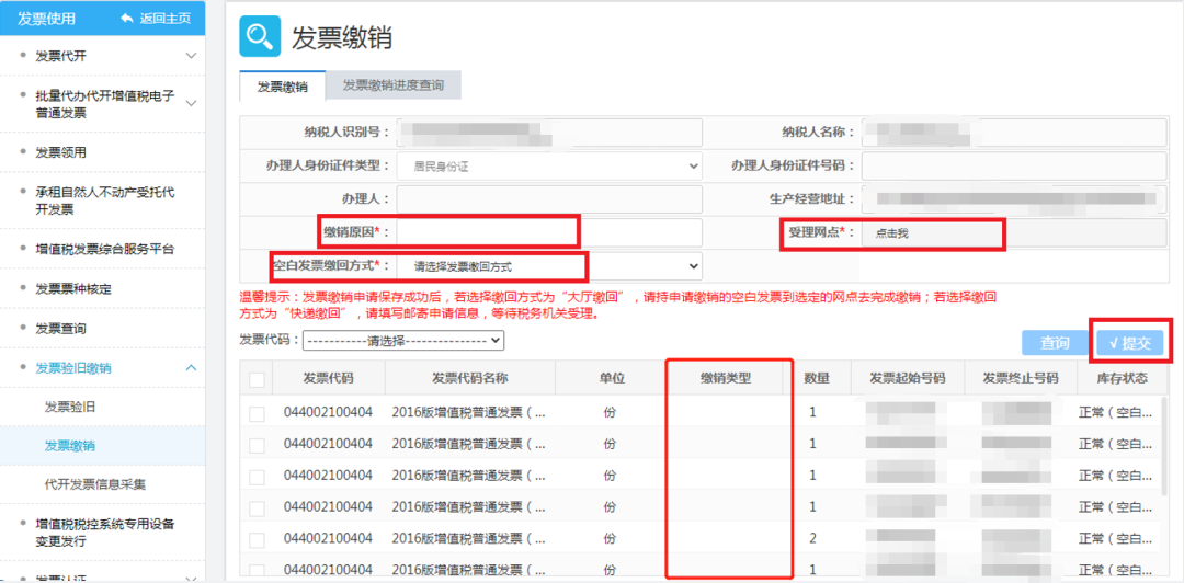 填写缴销原因、受理网点、空白发票缴销方式以及撤销类型,选择需要缴销的发票代码,系统会自动查询,将发票数据展示在待缴销列表中。勾选需要缴销的发票数据,检查无误后,点击“提交”按钮。