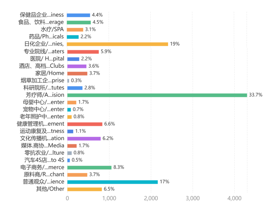 后台报名参观以芳疗师、日化企业、电子商务、健康管理机构、文化传播机构、专业院线、食品饮料添加企业、保健品企业、原料商、家居企业、酒店和高等场所、水疗SPA、科研院校、医院、药品生产企业、母婴中心以及芳香爱好者等专业观展人为主要群体,表示出了对活动极大的期待,咨询电话和短信、自媒体平台留言众多,后台观展预登记一跃冲破1.3W,创造芳香展历史上观展人数增长最快的记录。
