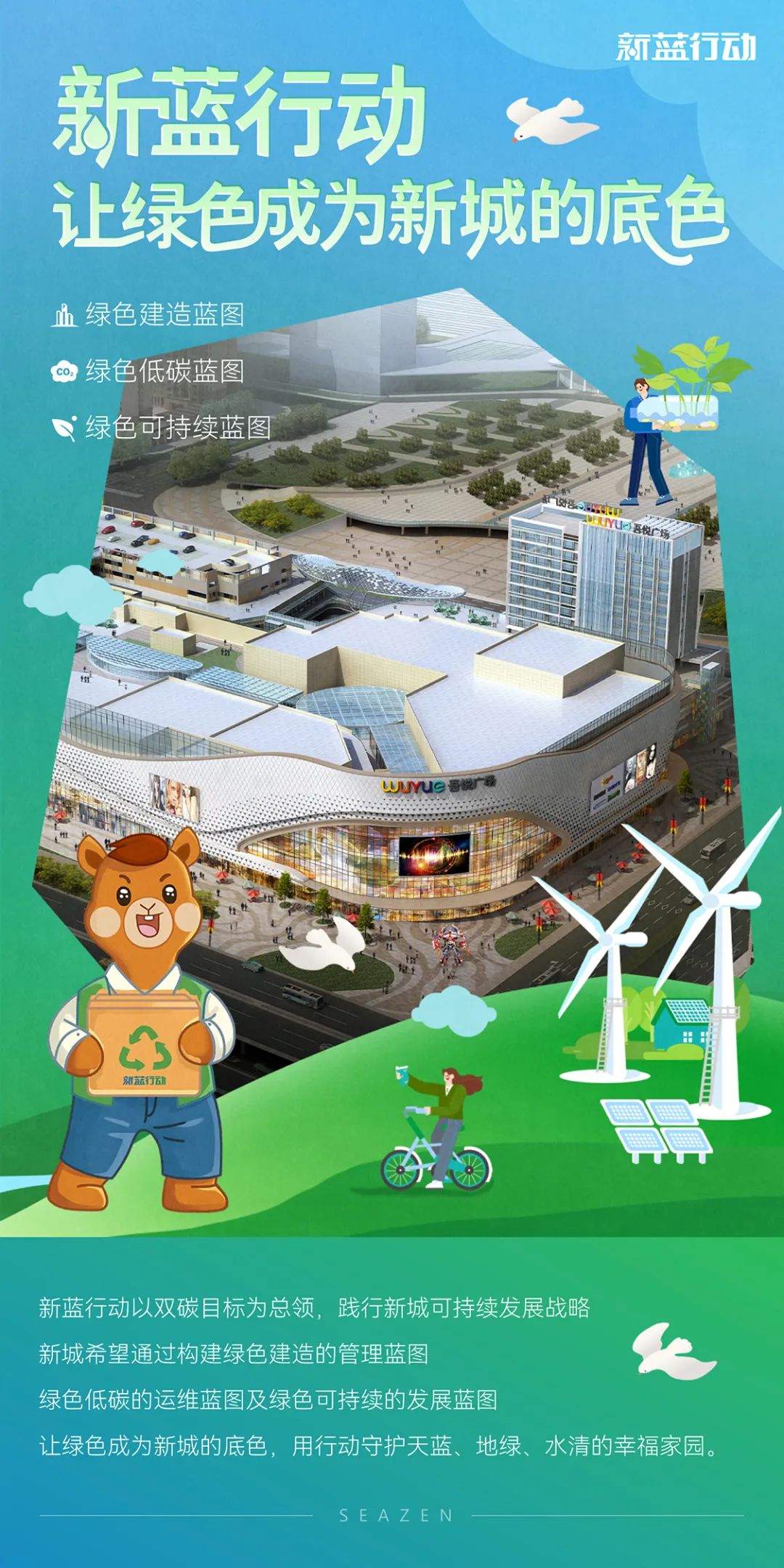 新城为商业屋顶安装太阳能光伏板,光伏系统产生的电能可供项目日常使用,以清洁能源替代传统化石能源,减少建筑能耗。