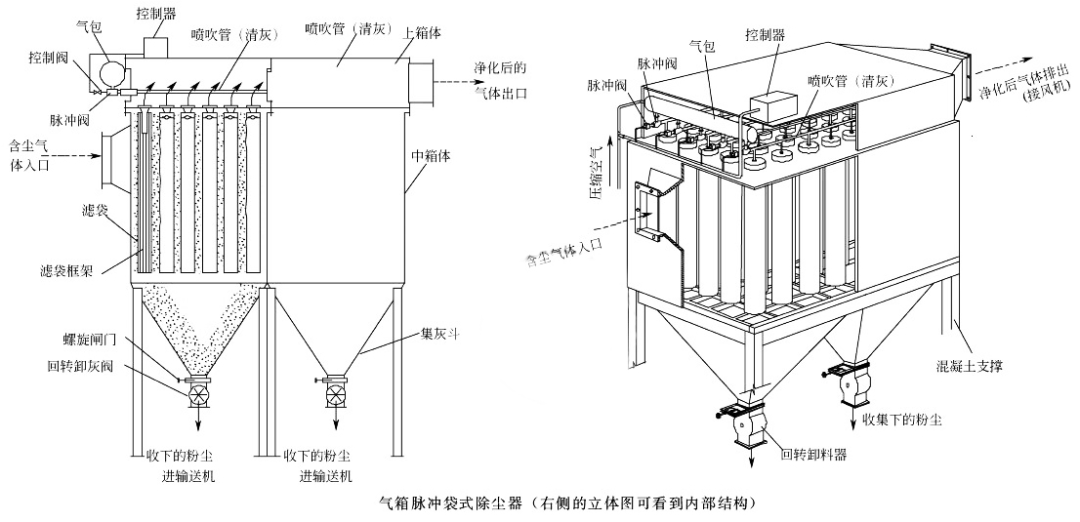 袋式除尘器一般由滤袋(透气但不透尘粒的纤维织物)、清灰机构(对阻留在滤袋上的粉尘要定时清理)、过滤室(箱体)、进出口风管、集灰斗及卸料器(回转卸料器、翻板阀锁风等)组成,过滤室内布有大量细长的滤袋,颗粒物被滤袋捕捉后,可以通过清灰系统进行清理。